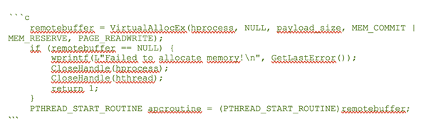 In diesem Beispiel sehen wir die Ausführung von meterpreter shellcode in einen neugestarteten Prozess (calc.exe). Meterpreter ist ein Bestandteil des Metasploit Framework und neben Cobalt Strike eines der am häufigsten benutzen C2 Frameworks.
