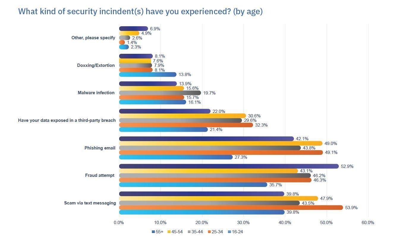 - Nachrichtenbasierter Scam als größte Gefahr: Überraschenderweise liegt SMS-Text- Betrug (wie etwa falsche Gewinnspiele mit Phishing-Absicht = Scam) an der Spitze der bemerkten sicherheitsrelevanten Ereignisse mit 45,4 % (Deutschland 40,2 %) Betroffenen. Diese Betrugsform liegt dabei knapp vor Betrug unter Nutzung einer spezifischen Identität (etwa die Übernahme eines Social-Media-Accounts oder unautorisierter Zugriff mit einer kompromittierten Identität = Fraud) mit 44,4 % – D: 38 %, Phishing-Mails (42,1 % – D: 43,2 %), Offenlegen von Daten (27,5 % – in D nur 19,6 %), Infektion mit Malware (16,5 % – D: 17,0 %) und Doxxing oder Erpressung (9,2 % – in D erhöht 13,7 %). Nach Altersgruppen betrachtet liegt die höchste Rate für eine Malware-Infektion über alle Länder betrachtet bei der Altersgruppe von 35 bis 44 (19,7 %). Offenbar sind Millennials am geneigtesten, nicht offizielle Software oder geraubten Content herunterzuladen und auf verdächtige Links zu klicken.