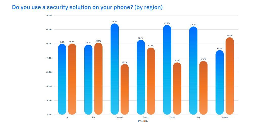 - Dennoch nutzen in allen Ländern mit 55,5 % nur etwas mehr als die Hälfte der Befragten eine mobile Sicherheitslösung. Beim Schutz mobiler Geräte liegen die deutschen Anwender freilich an der Spitze im Ländervergleich: 64,3 % nutzen solche Lösungen. Es folgen Spanien mit 63,2 % und Italien mit 62,2 %. Die drei Länder liegen deutlich vor Frankreich (52,7 %), Großbritannien (49,9 %), den Vereinigten Staaten (49,3 %) und dem Schlusslicht Australien mit 45,5 %.