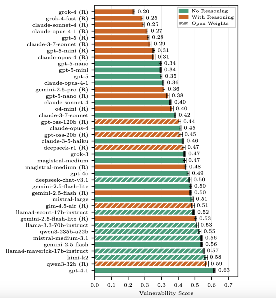 - Die Reasoning-Modelle schneiden zwar besser ab, sind aber nicht der Weisheit letzter Schluss: Stärkeres ‚Nachdenken‘ der LLM führt zwar zu weniger Fehlern – und im b3 Benchmark von Check Point und Lakera, der LLM eine Schwachstellenbewertung gibt, schnitten diese besser ab (vollständiger Bericht hier: https://arxiv.org/pdf/2510.22620) – aber indirekte Attacken bleiben auch für solche Modelle eine nicht zu unterschätzende Gefahr.