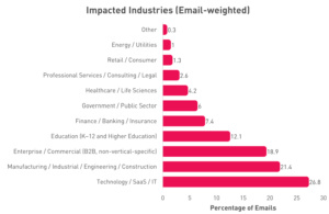 Die Kampagne zielt primär auf Sektoren ab, in denen Benachrichtigungen der oben beschriebenen Art häufig gesendet werden. Meistbetroffen ist daher der Bereich Technologie/SaaS/IT mit 26,8 Prozent, darauf folgen Fertigung/Industrie/Ingenieurwesen/Bauwesen mit 21,4 Prozent und Unternehmen/Handel (B2B) mit 18,9 Prozent.